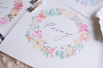 運用簡易的水彩花朵,拼湊出色彩斑斕的花環作品。