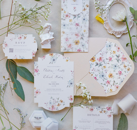 Each piece in this suite is meticulously crafted to reflect an aesthetic that is both refined and enchanting. The delicate watercolor florals and graceful calligraphy add a personal touch, making your invitations as unique as your love story.